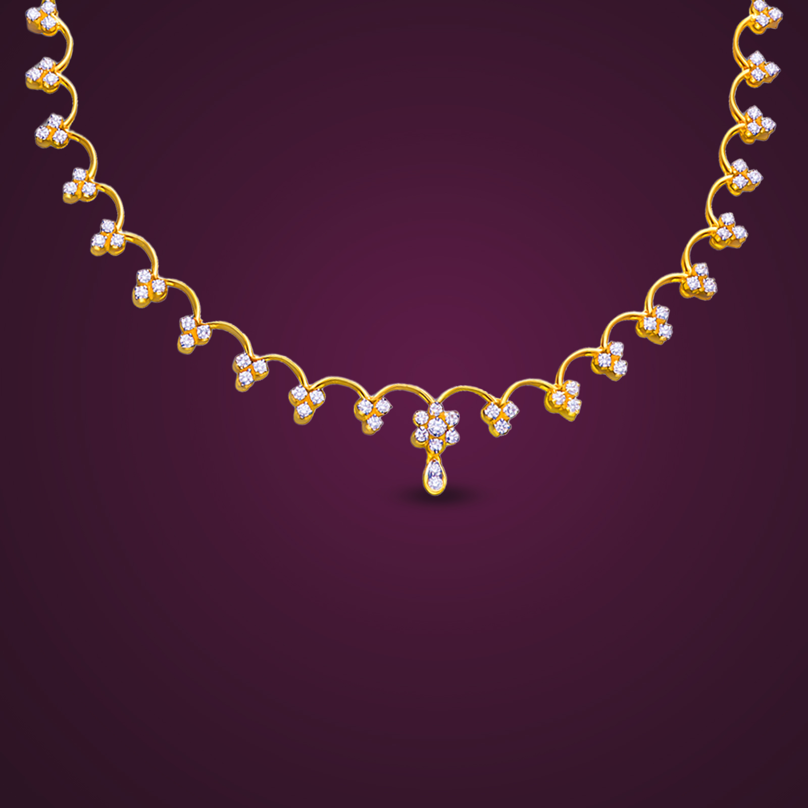 Invite good fortune and elegant style with the charming Claver Necklace. Expertly crafted in gleaming 18K gold, this piece features delicate, repeating motifs, most likely inspired by the four-leaf clover. The pattern is meticulously set with 2.20 carats of brilliant-cut diamonds, creating a sparkling, continuous chain that sits beautifully along the collarbone. This necklace is perfect for adding a touch of sophisticated symbolism to your daily or semi-formal attire.