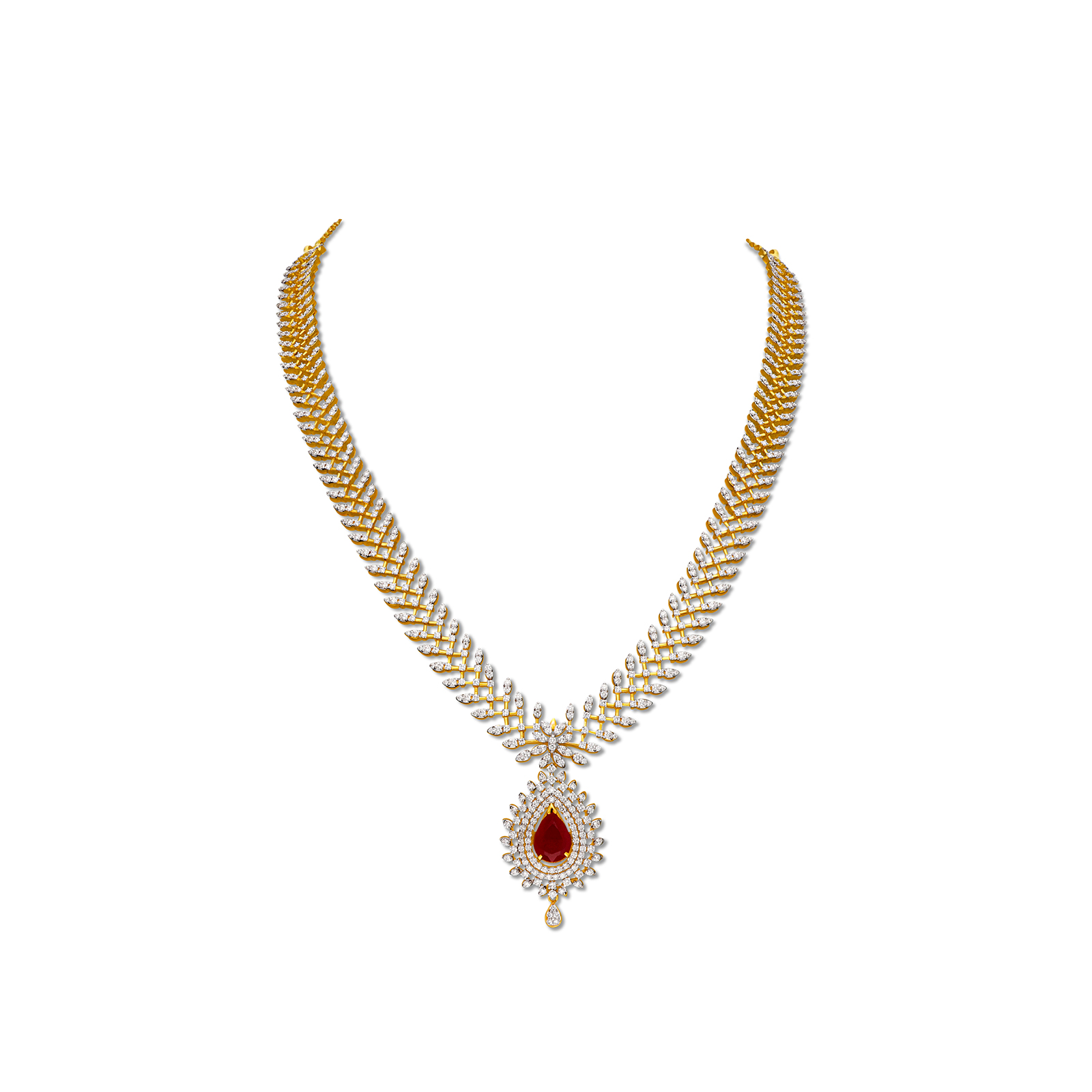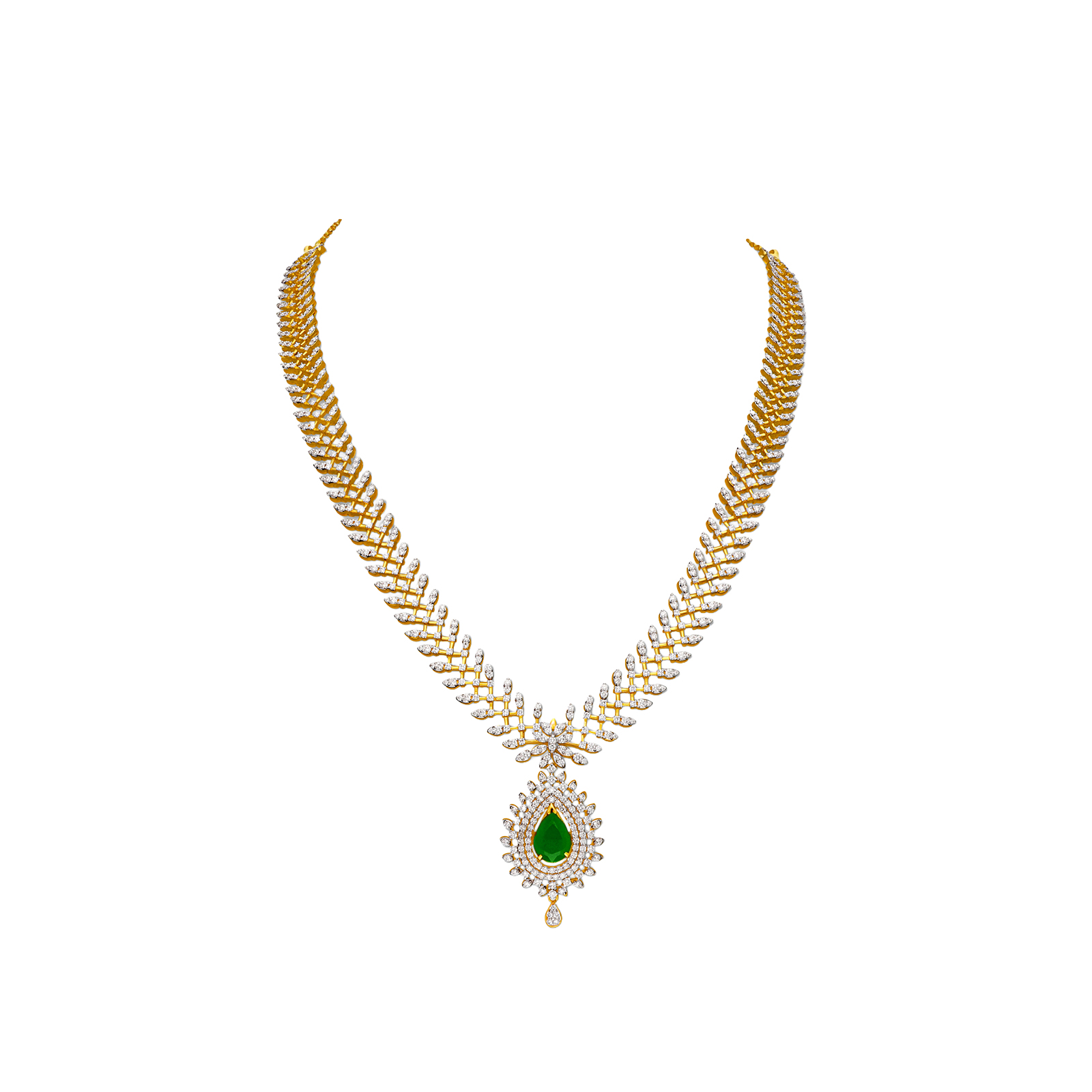 Design: A traditional, long Haram necklace with a high-impact, continuous design, featuring color-changing gemstones.