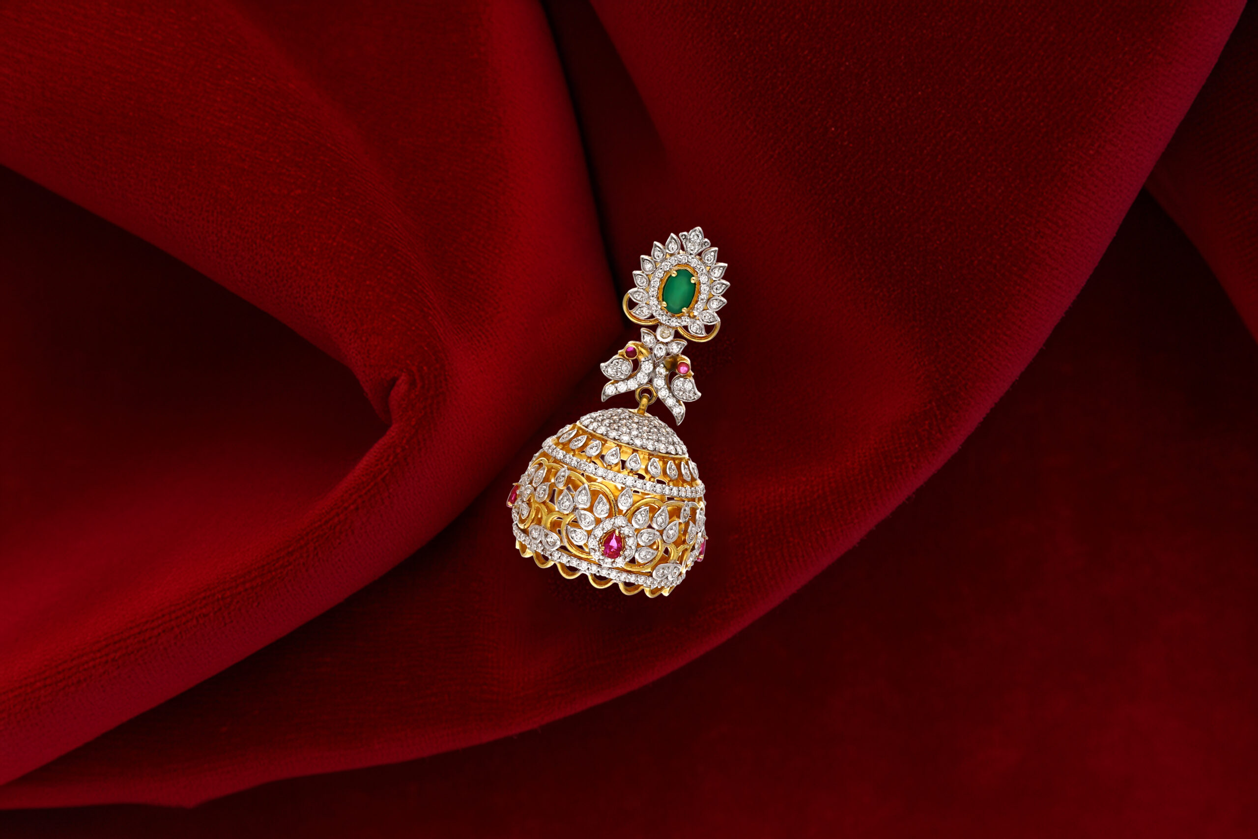 Design: Traditional bell-shaped drop earrings (‘Jumiki’) with an intricate, nature-inspired ‘Honey Bee’ motif.