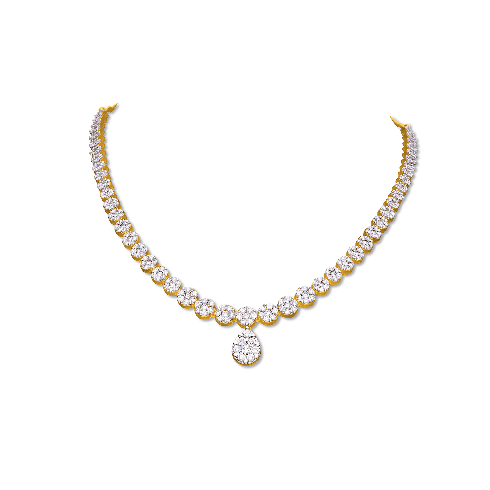 Command attention with the luxurious brilliance of the Pressure Set Necklace. Masterfully crafted in gleaming 18K gold, this necklace utilizes the sophisticated pressure-setting technique, where multiple smaller diamonds are meticulously set to create the powerful visual effect of much larger stones. The result is a stunning 5.95 carats of continuous, fiery sparkle, offering a truly magnificent presence around the neckline.